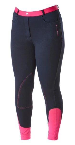 Great value pull on Ladies Breeches, Firefoot text branding on leg, branded waistband, self knee patches, zig zag cover stitching, stretchy lycra ankles and hook and bar fastening. Cotton and Spandex mix ensuring a comfortable feel.