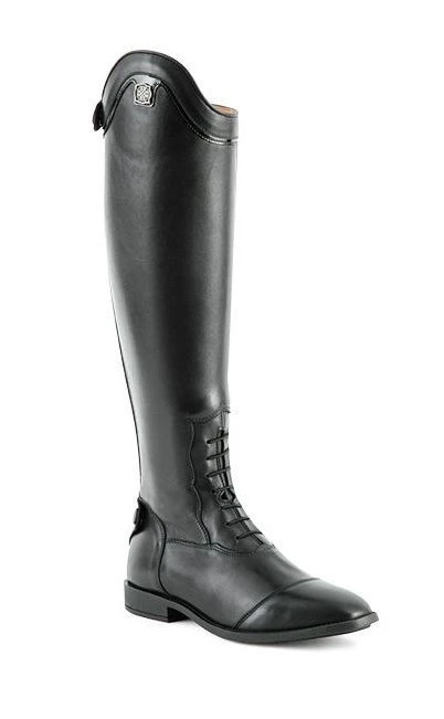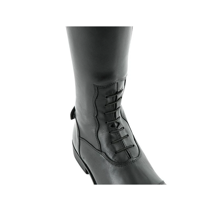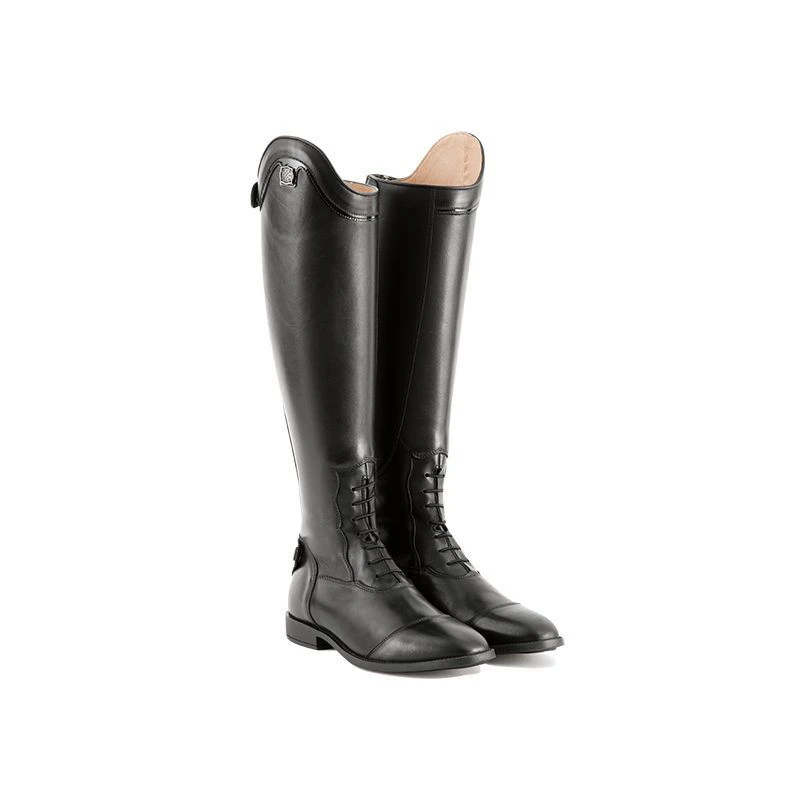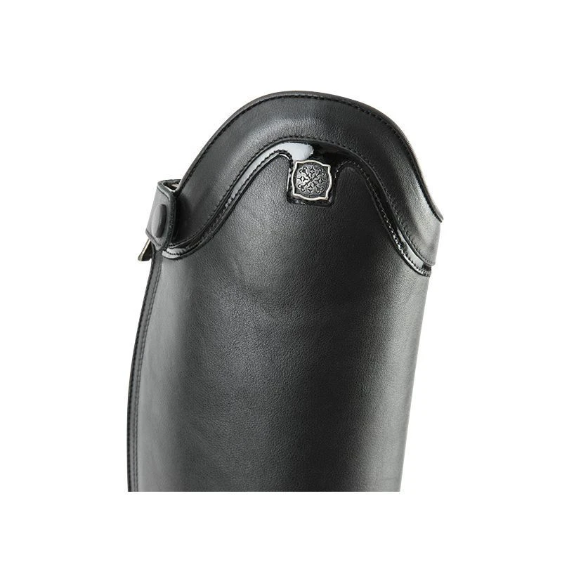 This long leather field boot is handcrafted in Portugal using the finest quality European leather. The dressage bow top caresses the leg around the knee and the boot contours perfectly around the lower leg for the ultimate fit. The touch of patent around the top dds a touch of subtle flare without being overpowering.