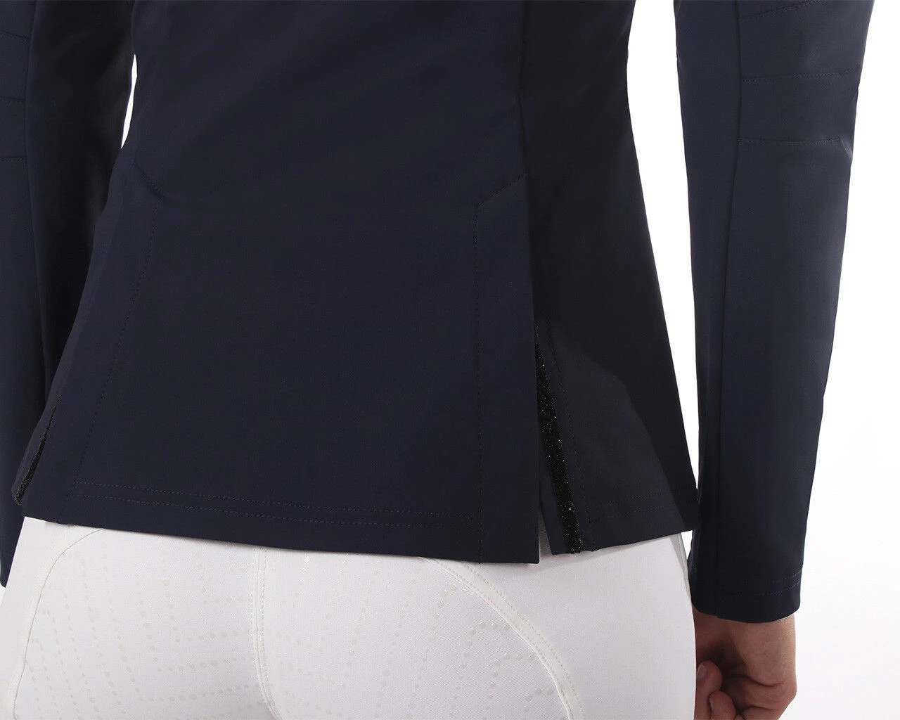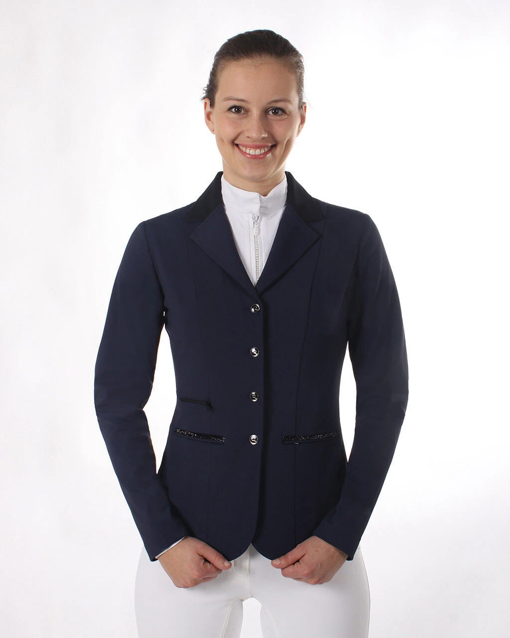 Shine during your competition with this chic competition jacket. The jacket has a concealed zipper behind the button closure so that the buttons won’t pull. The stretchy, breathable fabric ensures a comfortable ride and is also water-repellent. The glitter tape on the zip pockets and black faux zip pocket complete the jacket.