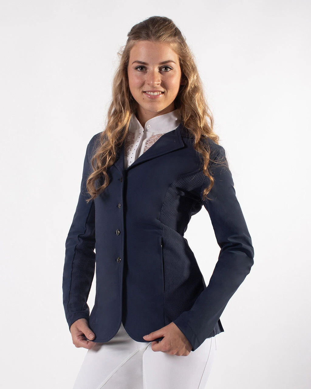 Sporty competition jacket with mesh on the sides, under the sleeves, on the rear and collar. The mesh makes the jacket very breathable and perfect for summer. The jacket features a hidden zipper behind the button closure and two hidden zipper pockets on the front.