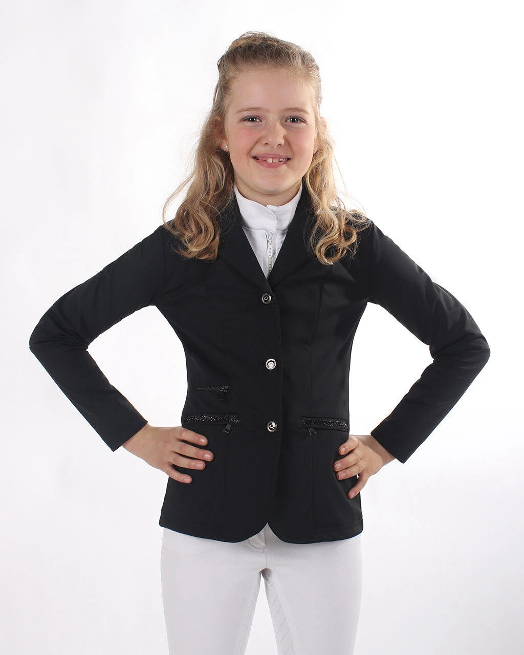 Shine during your competition with this chic competition jacket. The jacket has a concealed zip behind the button closure so that the buttons won’t pull. The stretchy, breathable fabric ensures a comfortable ride and is also water-repellent. The glitter tape on the zip pockets and black faux zip pocket complete the jacket.