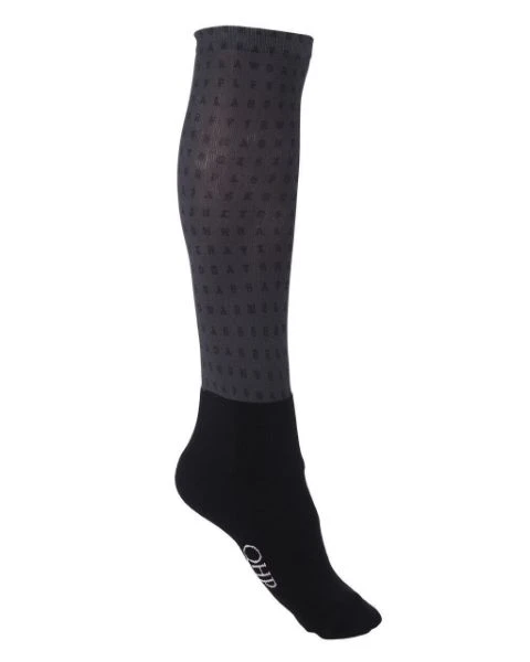 Socks with a striking print on the leg. The fabric around the calf is extra thin to fit easily into riding boots. The foot is soft and thick and the stockings support the ankle.