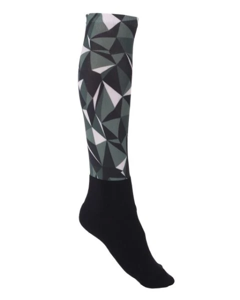 Socks with a striking print on the leg. The fabric around the calf is extra thin to fit easily into riding boots. The foot is soft and thick and the stockings support the ankle.