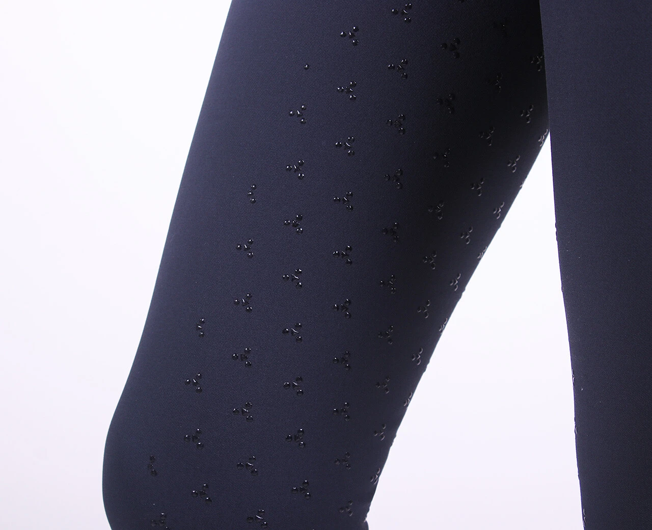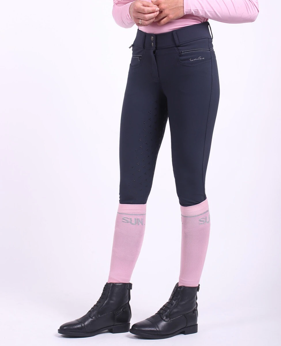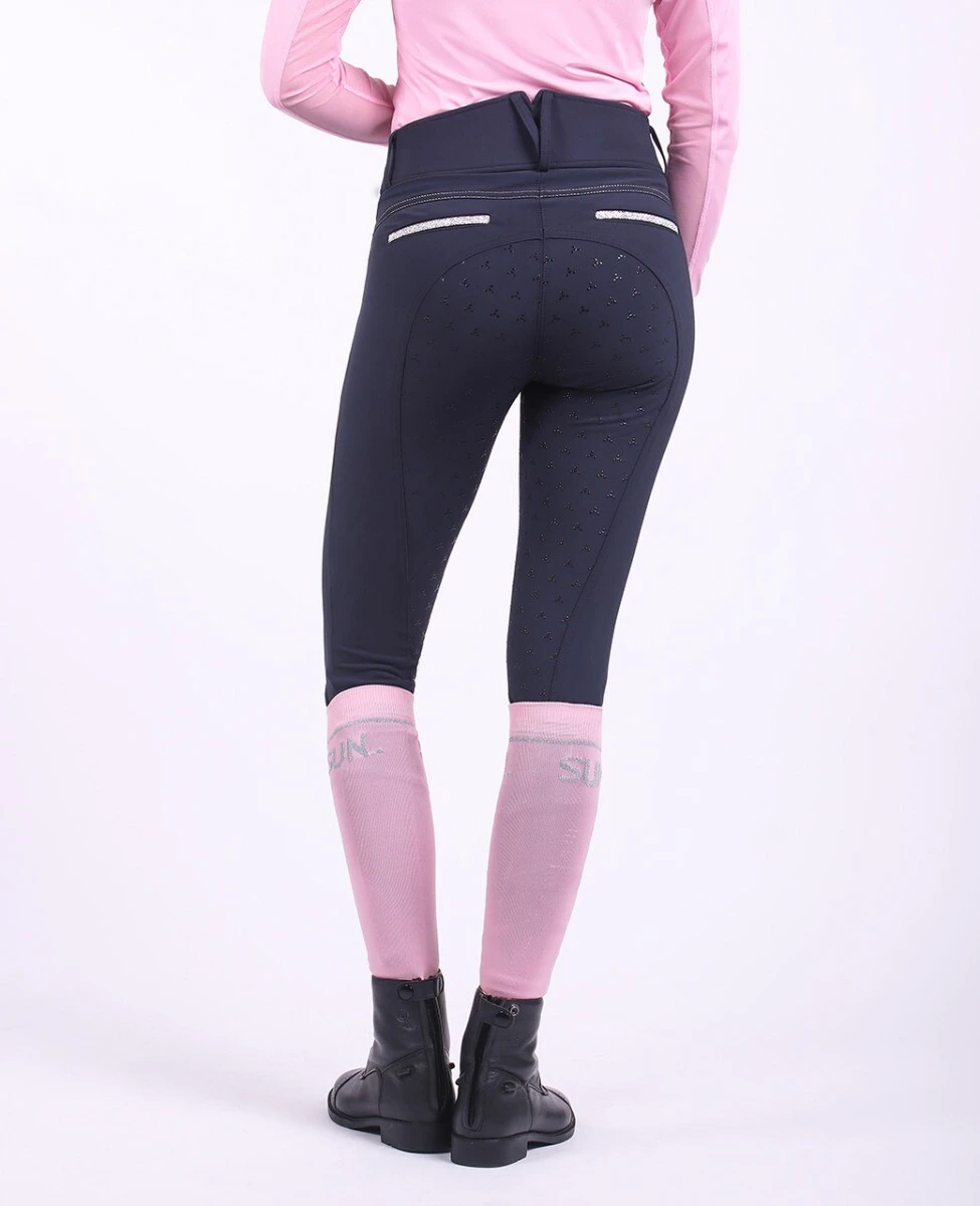 Riding breeches Maxime provides a comfortable ride due to the soft and stretchy fabric. The high waist, decorative silver stitching and glitter faux pockets give the breeches an elegant look. With a dotted silicone seat for a fun touch.