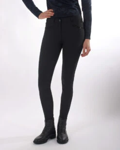 Chic breeches with a dotted silicone seat for good grip. The sequins on the pockets make the breeches stand out. In addition, the breeches are very comfortable thanks to the soft, stretchy fabric.