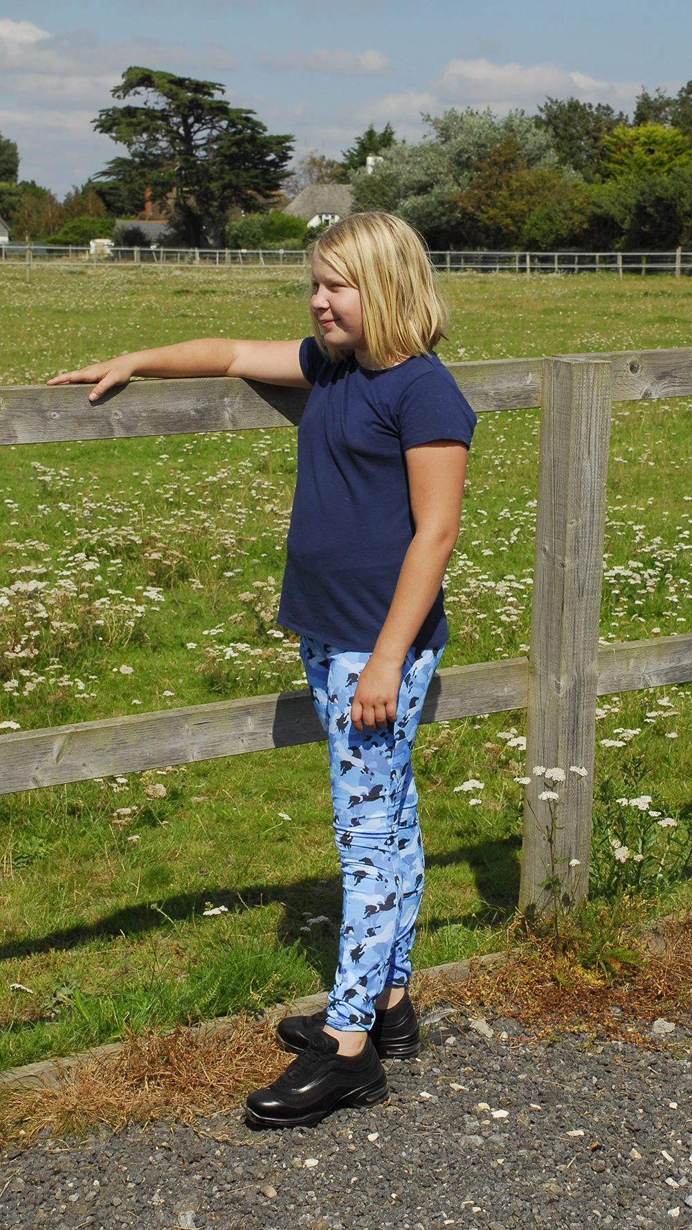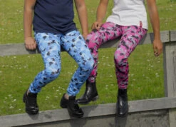 Junior riding tights in a fun pony camouflage print with a silicone full seat and inside leg for grip. Pull on style tights with a stretchy, soft waistband for comfort.